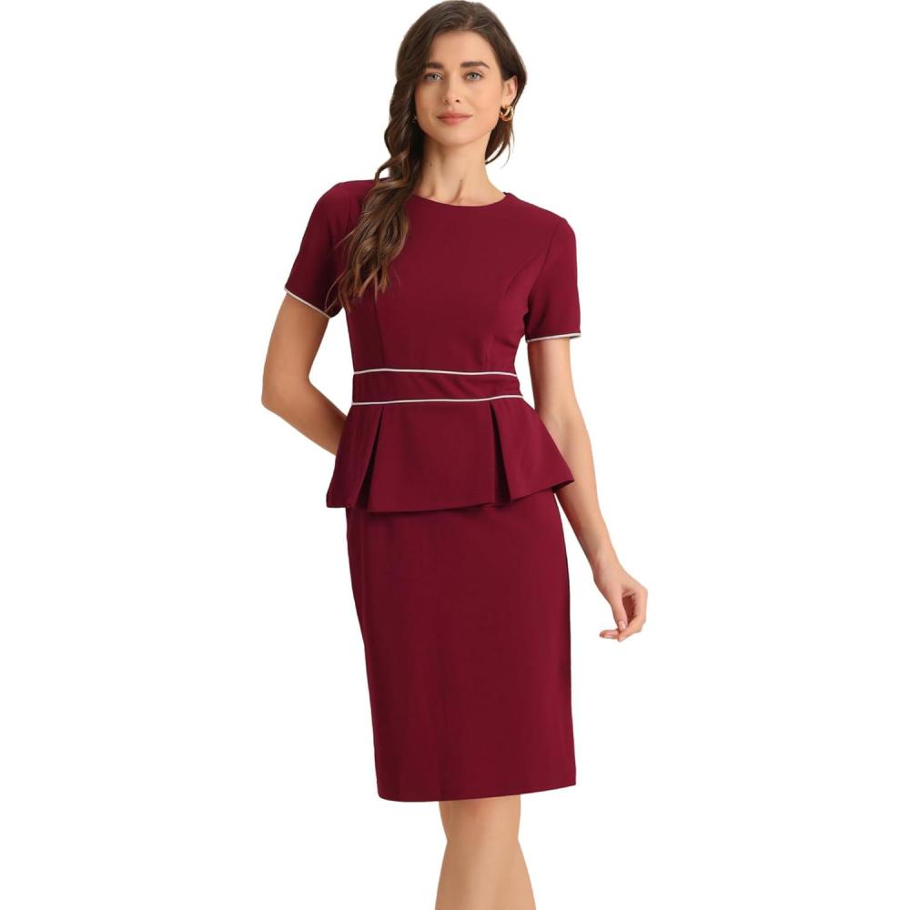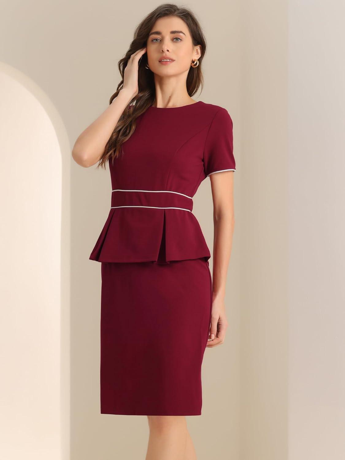 Allegra K Women’s Work Sheath Dresses Crewneck Pencil Business Peplum Dress(Burgundy)