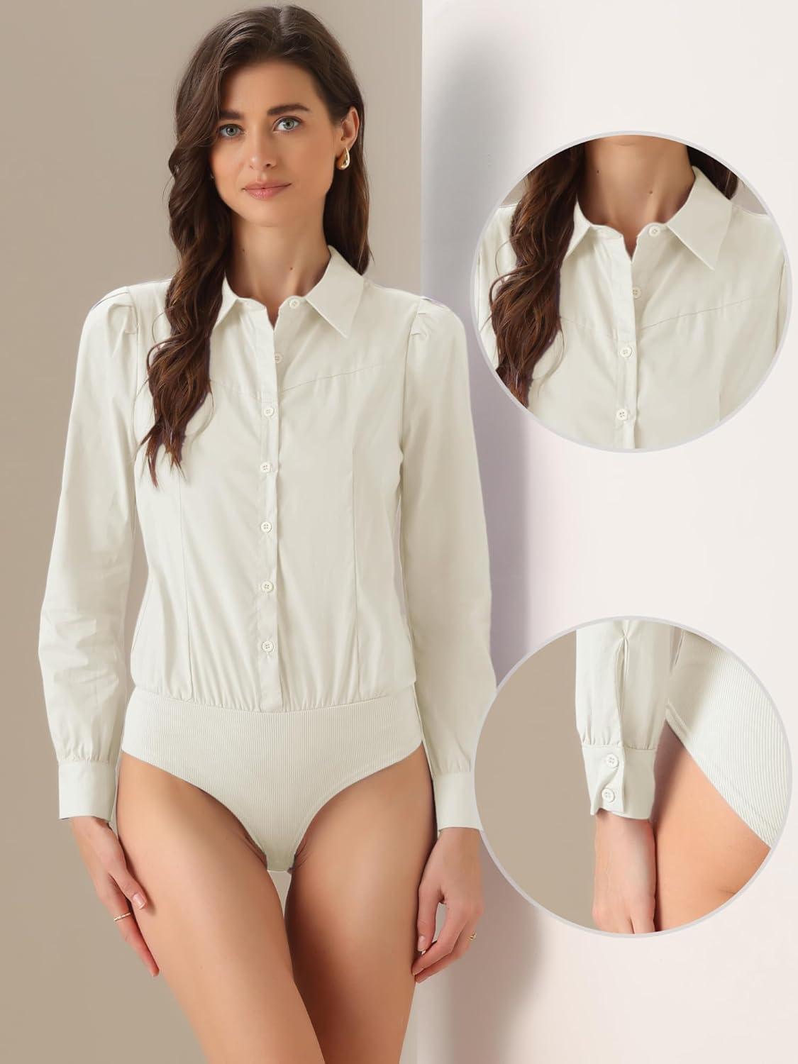 Allegra K Work Body Suits for Women Office Button Down Shirt Collared Long Sleeves Bodysuit Top(Black)