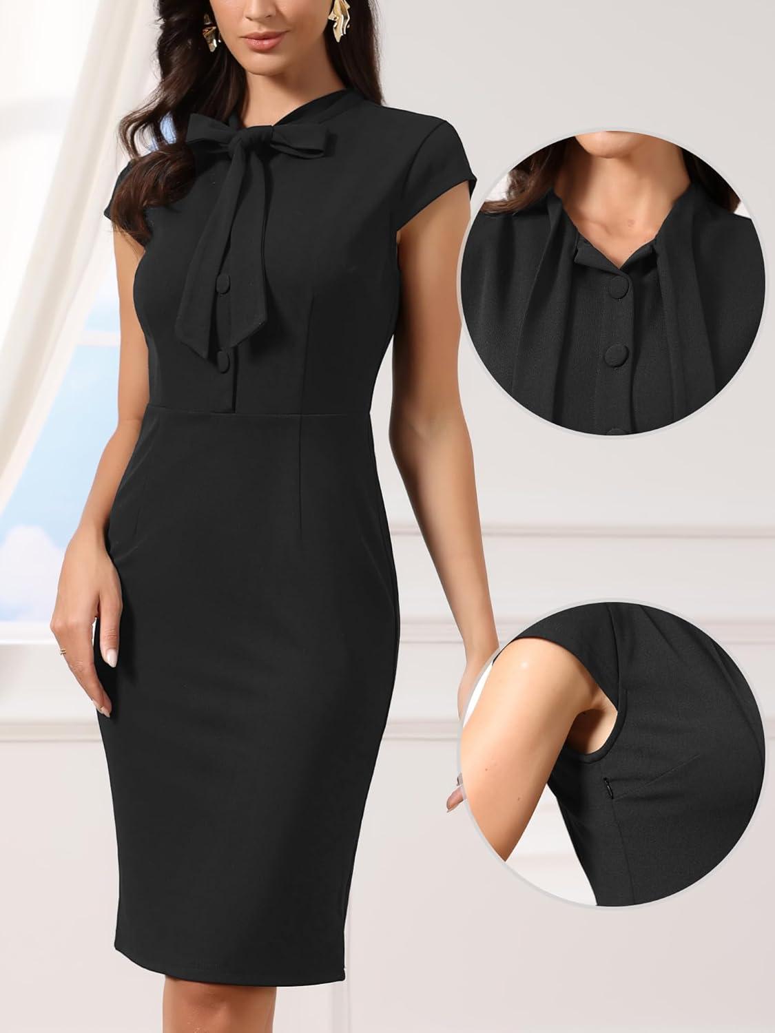 Allegra K Work Dress for Women Cap Sleeve Bow Tie Side Zipper Sheath Business Casual Bodycon Dresses(Black)