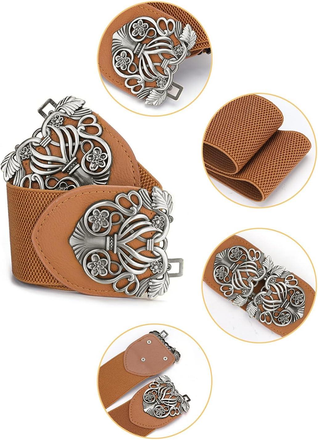 uxcell Retro Knot Woven Metal Interlocking Buckle Elastic Waist Cinch Belt Band(Floral Buckle-brown Band-black Buckle)