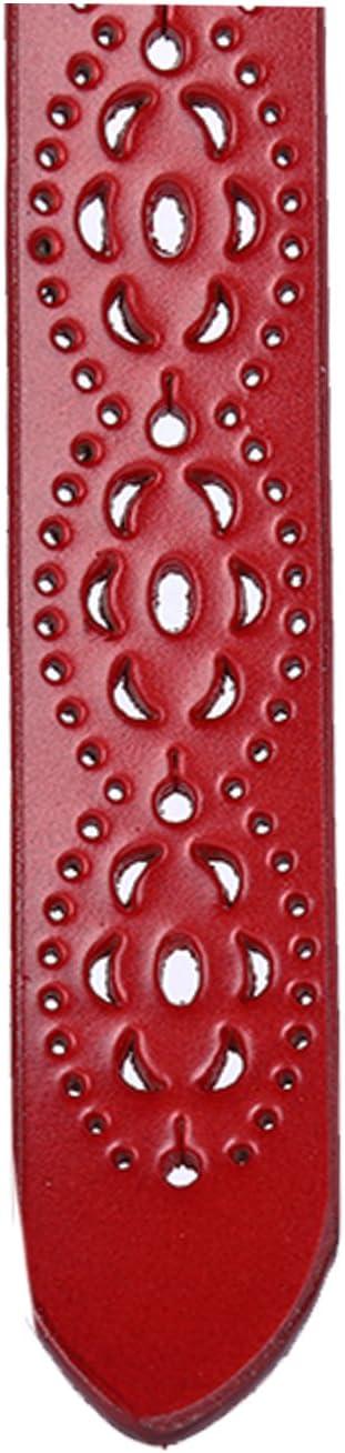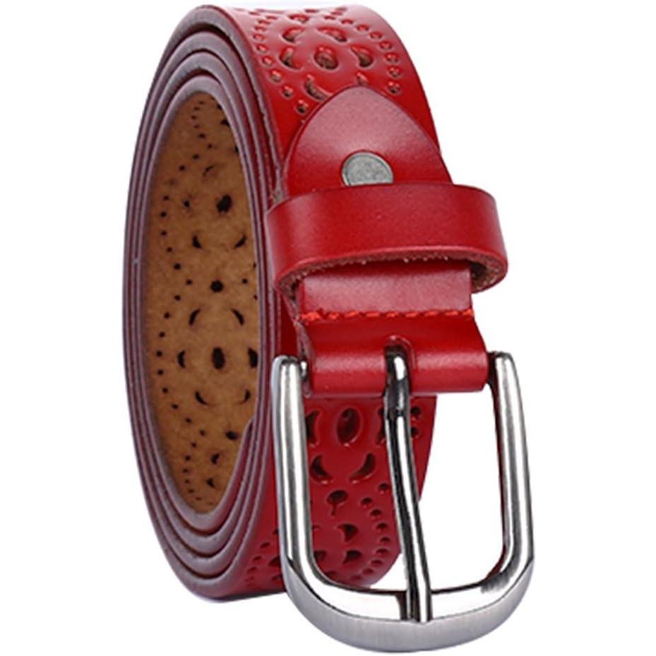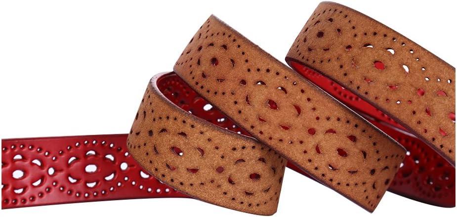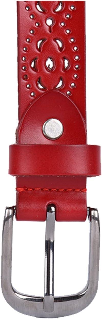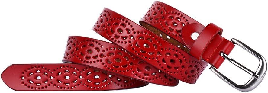 uxcell Women Carved Multi-hole Hollow Alloy Pin Buckle Leather Belt(Red-flowers)