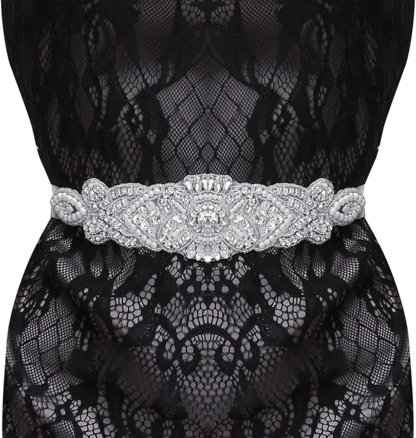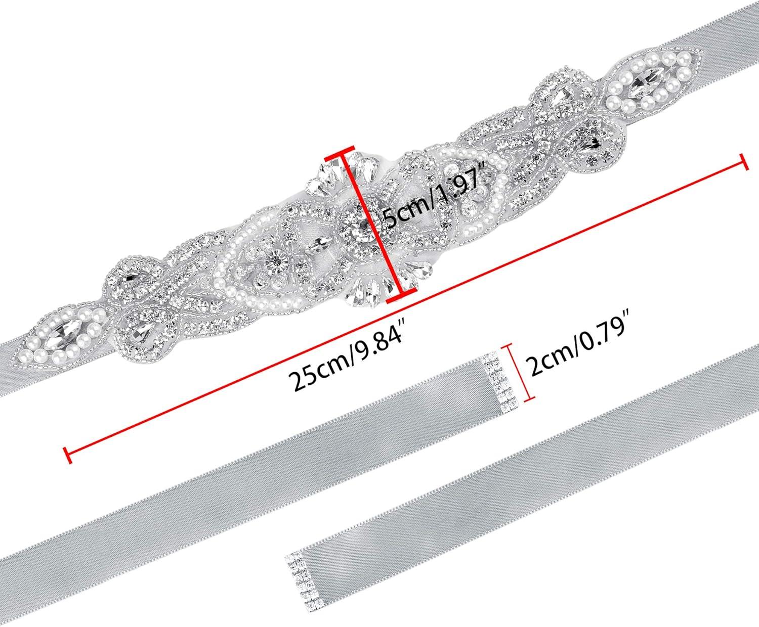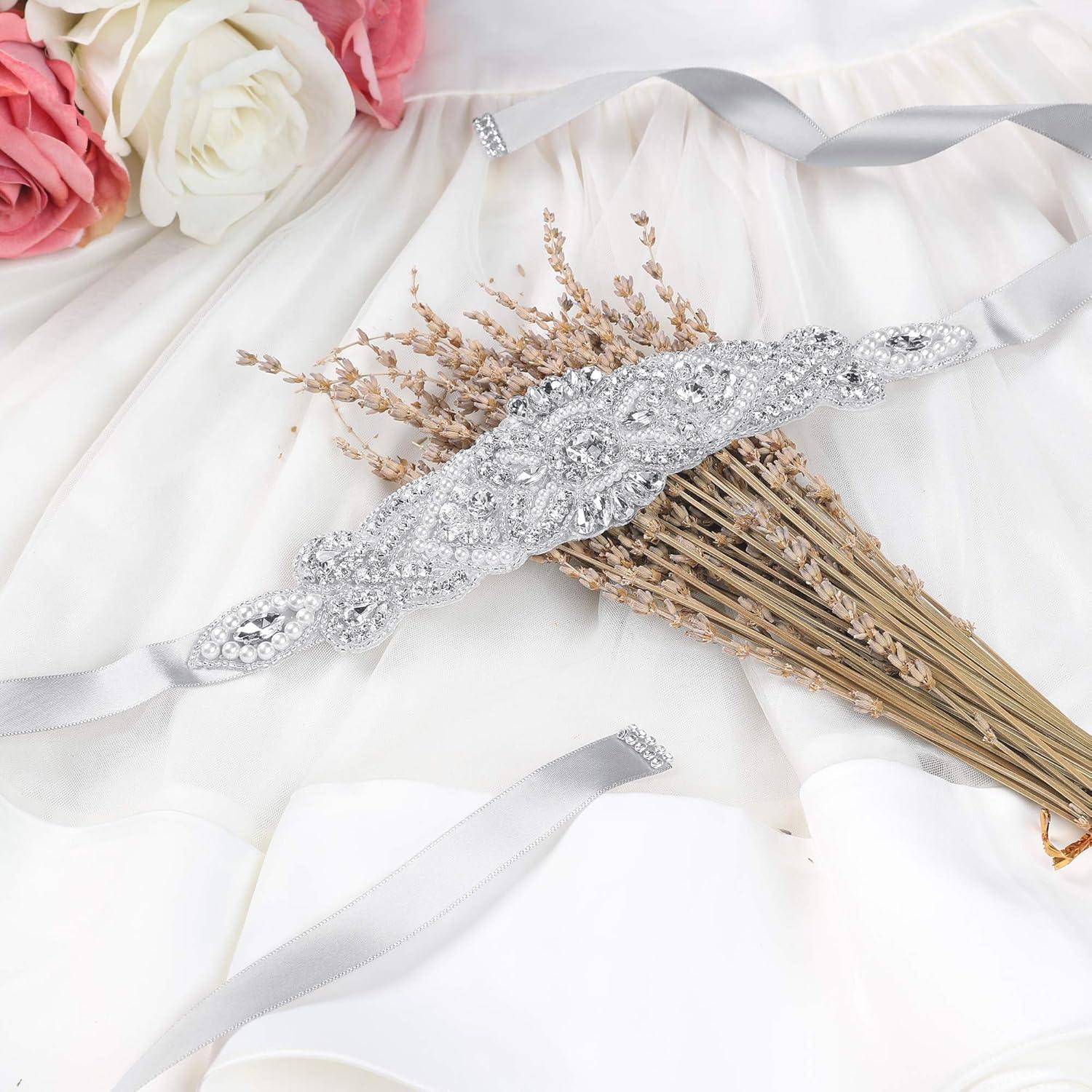 uxcell Women Rhinestone Bead Decor Satin Ribbon Wedding Belt(Gray)